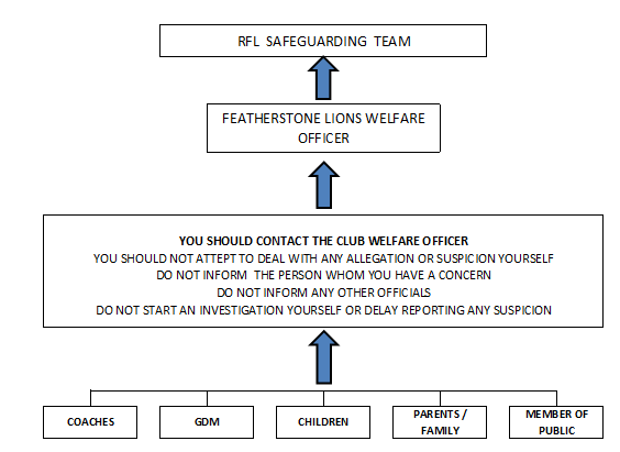 Please contact the club welfare Officer. A Cause for Concern Form should be completed regarding any concerns relating to the behaviour of any child or adult involved in or spectating at our club. These may include general concerns about a child’s welfare, concerns about bullying or poor practice, suspicions or allegations of misconduct, or allegations of abuse A cause for concern form can be obtained from the Team Manager or downloaded from our website www.featherstonelions.co.uk/safeguarding Anyone making a disclosure can be confident that the matter will be handled appropriately and with an appropriate level of confidentiality.